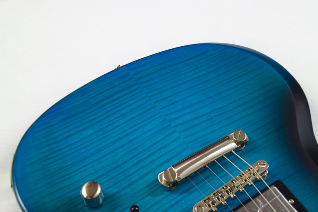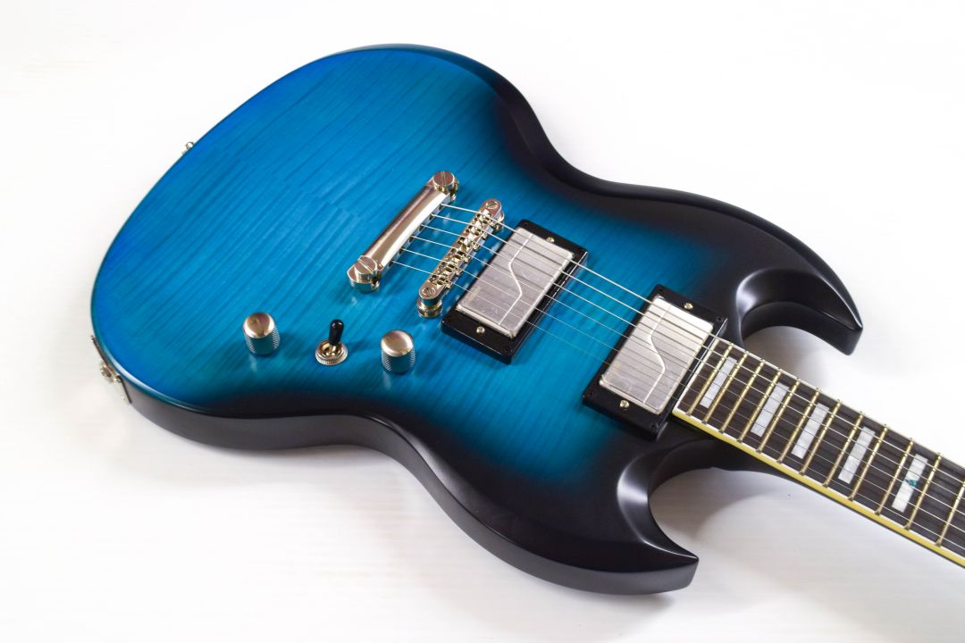- Mahogany body with attention-grabbing hard-maple top — a departure from the SG’s typical workhorse design